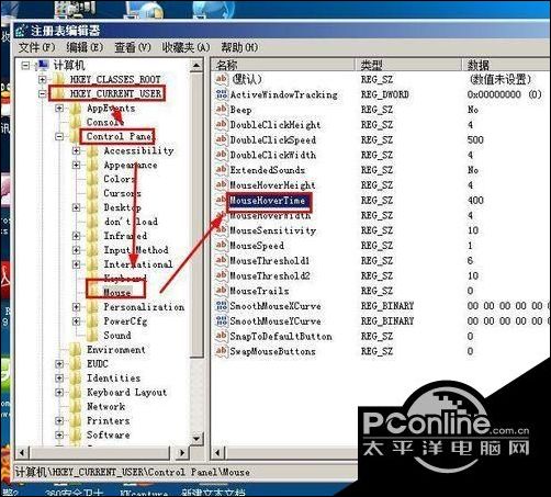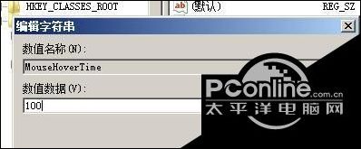 3、找到hoke_current_user>>control_panel>>mouse>>mousehovertime,双击它,设置数值为100。这样鼠标移动到任务栏的时候就会立即显示缩略内容。增加了电脑操作的流畅性;