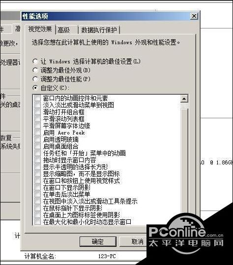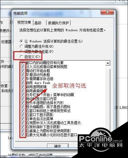3、勾选自定义,然后将所有特效全部取消。点击确定即可;