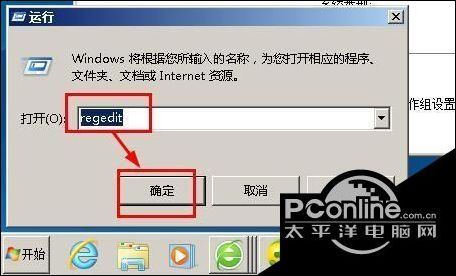 2、输入regedit,点击确定;