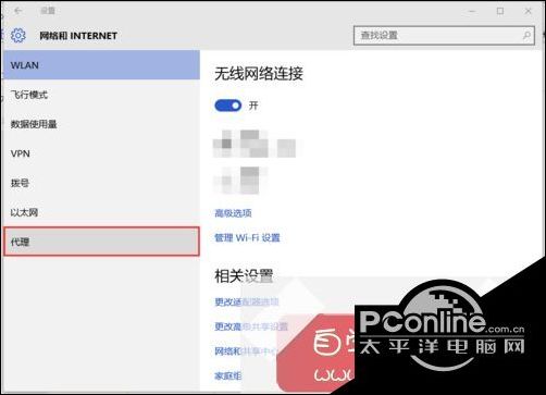 2、在“网络和Internet”窗口左侧选择“代理”菜单。