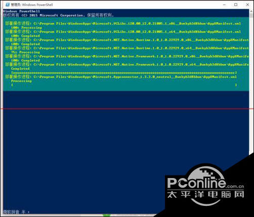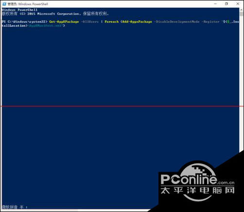 2、执行以下代码:Get-AppXPackage -AllUsers | Foreach {Add-AppxPackage -DisableDevelopmentMode -Register “$($_.InstallLocation)\AppXManifest.xml”}。