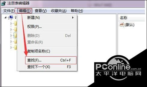 b、在打开的注册表编辑器中使用查找功能。