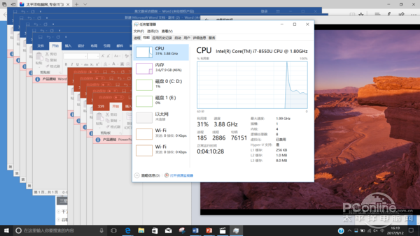 作为一款i7的处理器日常办公已经难不住它了,所以我这次选择了几种比较极端的测试来看一看它的性能表现。首先让我们看看打开5个PPT、5个Word文档和5个网页再播放2K视频时的表现吧!经过测试我们可以看到,在如此极限的办公情况下,这台电脑的CPU负载仅仅为31%。