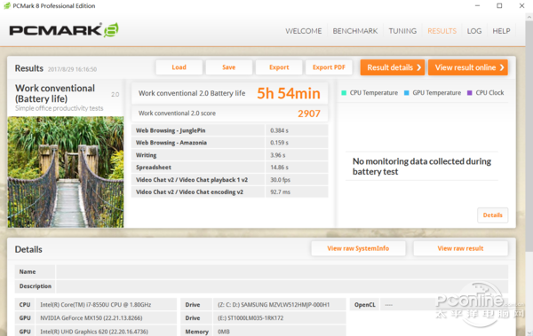 虽然在性能方面有着十分巨大的提升,但TDP并没有增长依旧为15W,并且进行测试的这台机器还搭载了标压的MX150独立显卡。经过PCMark 8工作模式的测试,在高负载的情况下消耗80%的电量,使用时间达到了6个小时。