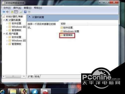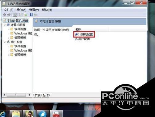 3、弹出“本地组策略编辑器”页面,在该页面的右边双击“计算机配置”;