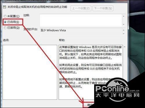8、弹出的对话框中,选中“已启用”,然后单击确定就可以了。这样当再遇到未关闭程序时,Windows 7系统将自动终止,这样可以让关机更快。