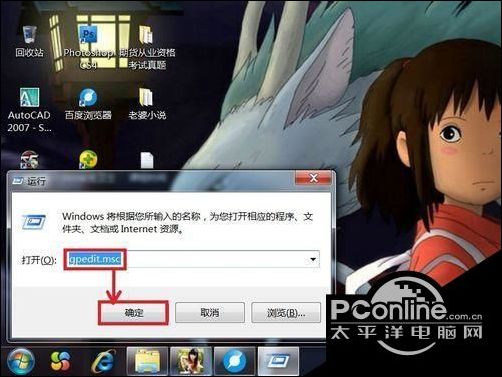 2、在弹出的运行对话框中输入“gpedit.msc”,然后单击“确定”;