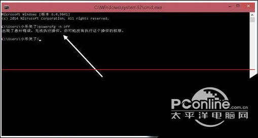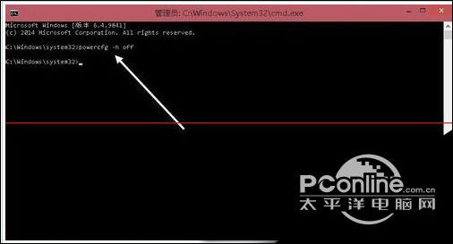 4、命令窗口中输入 powercfg -h off,即可关闭休眠功能,同时 Hiberfil.sys 文件也会自动删除。
