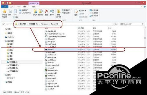 6、这时,可以找到系统盘文件夹Windows/system32中的cmd.exe文件,或者在开始菜单中,找到所有程序 > 附件 > 命令提示符图标