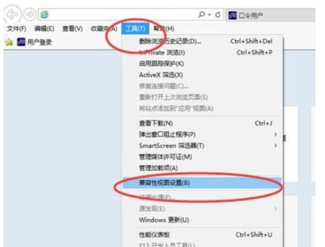 4、在显示出的菜单栏中,单击工具菜单,菜单中选择 兼容性视图设置。之后也会打开兼容性视图设置窗口。