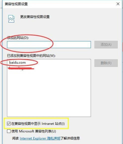 2、弹出兼容性视图设置窗口,将网址添加进来,并勾选上 在兼容性视图中显示Internet网站(默认是勾上的),然后关闭即可。