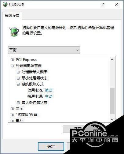 3、查看下“处理器电源管理”项目下的“系统散热方式”是什么样子的,如果是系统默认的“被动”,速度改成“主动”,这样不管大家的笔记本是在何种运行状态,风扇都会持续运转散热,不会等到温度飙升临界点的时候再工作了。