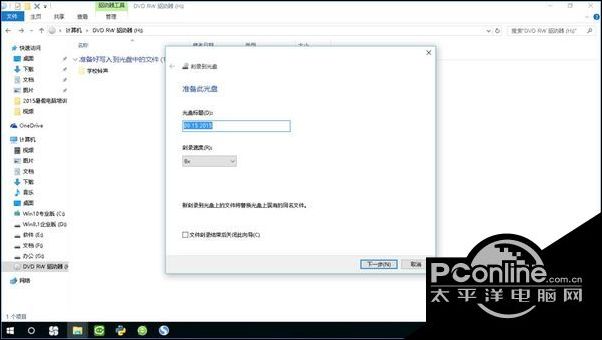 7、右键单击刻录机图标,在弹出的快捷菜单里选择单击“刻录到光盘”按钮,启动“刻录到光盘”向导,进入“准备此光盘”窗口,设置好光盘标题和刻录速度(如图),单击“下一步”按钮,Win10自动完成光盘的刻录。