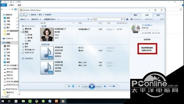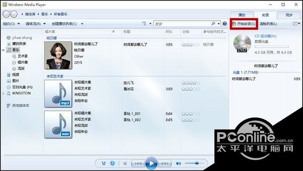 8、如果选择“刻录数据光盘”,单击“下一步”,系统会调用Windows Media Player,此时我们只需要创建刻录列表,单击“开始刻录”按钮,Win10将自动完成刻录工作(如图)。