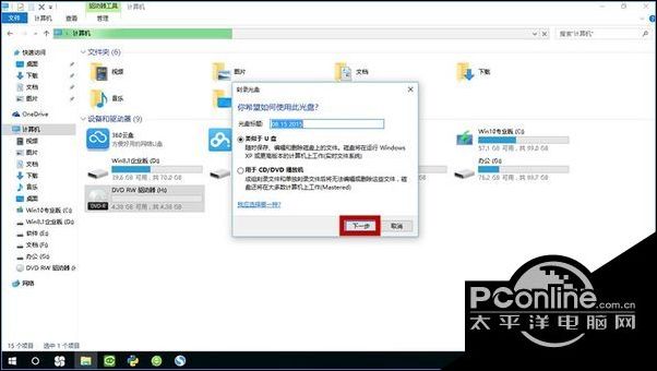 6、选择”用于CD/DVD播放机“模式。单击“下一步”,系统不会对空白光盘进行格式化,而是直接打开,将需要刻录到光盘的文件复制/剪切再粘贴或直接拖动进来。