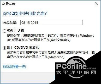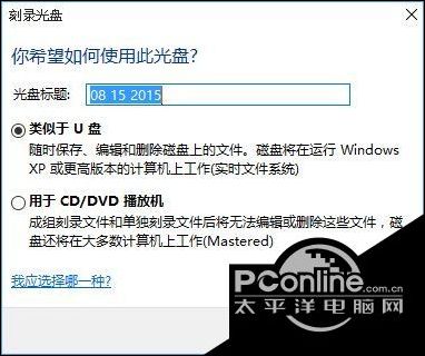 这里有两个选项:一个是“类似于U盘”;另一个是“用于CD/DVD播放机”。选择“类似于U盘”,将刻录一张可以随时保存、编辑和删除文件,可以在WinXP或更高版本的计算机上运行的光盘(实时文件系统);选择“用于CD/DVD播放器”模式刻录光盘,光盘可以在大多数计算机上工作,但是光盘中的文件无法编辑或删除。