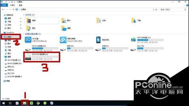 2、单击任务栏的“文件资源管理器“,点击”计算机“,双击打开刻录机图标。