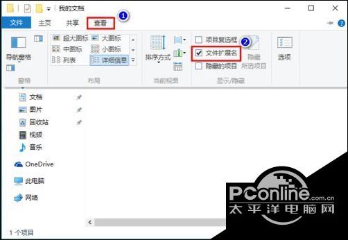 1、首先,在Win10中随便打开一个文件夹,再将“查看”菜单下的“文件扩展名”勾选上。如果已经勾选,此步可省略。
