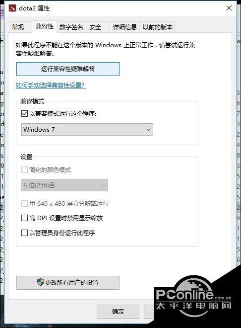 2、找到你的dota2应用程序的位置,同上一步一样。右键点击它,选择属性选项。如图点击第二项兼容性,在下面的兼容模式一栏中勾选以兼容模式运行这个程序,选择你升级win10之前的系统,点击确认。