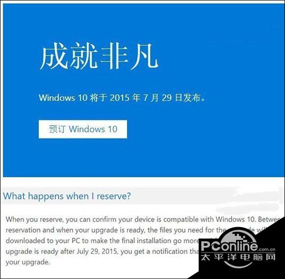 “当你接受预定后,你将能够确保你的设备兼容Windows10。在预订期内,当你的设备已准备好升级时,系统会自动将升级所需要的文件下载到你的电脑上,这将使得最终的升级安装过程更加快捷。随后,等到2015年7月29日正式发布时,你会收到升级通知并开始升级。”