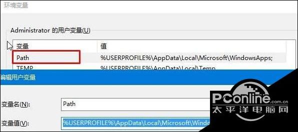 4、双击上面框中的“Path”,将变量值修改为:%USERPROFILE%\AppData\Local\Microsoft\WindowsApps,点击确定;