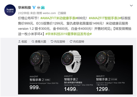 是不是很多人已经迫不及待的想要知道,此次华米科技新品的价格是多少。我们来回顾一下,AMAZFIT智能手表2标准版售价999元,复仇者联盟系列限量版售价1499元,AMAZFIT智能手表2ECG版本售价为1299元。这个售价在同级别产品中,相当有竞争力。看来智能穿戴行业又要被华米科技重新细分了。