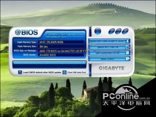 5、安装@Bios后,双击打开程序,如下图所示,需要用到管理员账号权限才能运行。在左侧的第三行可以看到当前版本的Bios,小编目前是770T-UD3P的主板,F7代表Bios版本号。