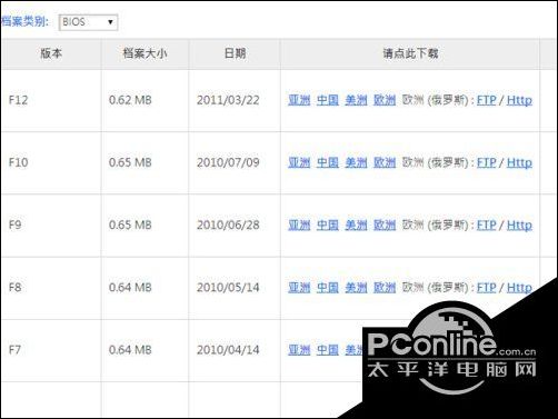 3、进入Bios页面后,由上至下是该主板的正式版Bios,其中最上方为最新的版本,一般来说最新版本功能最全,稳定性也比较强,然后就选择站点就近下载即可。下载完Bios后,在工具软件页面,用同样方法下载@Bios。