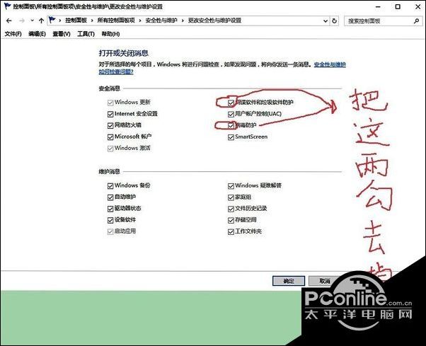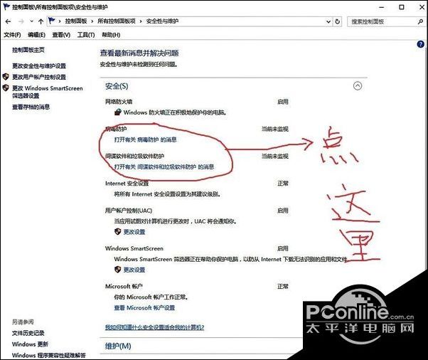 4、分别点“打开有关病毒防护的消息”和“打开有关间谍软件和垃圾软件防护”两个地方进行设置。