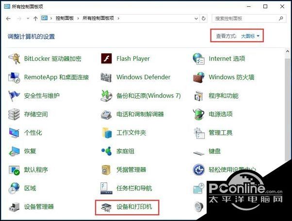 2、将查看方式修改为“大图标”,点击“设备和打印机”;