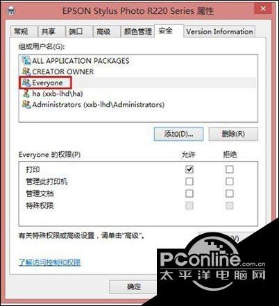 8、回到了打印机属性界面【安全】选卡中,在【组和用户名】下面选中“Everyone”,在下面权限框中将所有的选项都勾选“允许”,点击应用并确定,重启计算机即可。