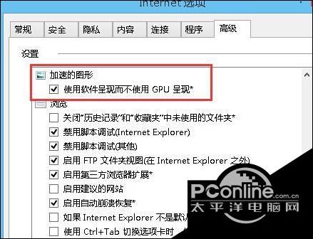 3、在“高级”选卡下方设置窗口中,找到“加速的图片”,然后勾选下方的“使用软件呈现而不适用 GPU 呈现*”,点击确定即可。