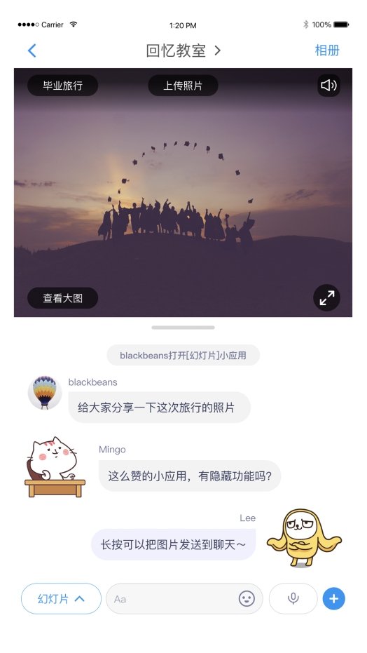 作为一个有特色的同屏小功能,与你幻灯片小应用将共享相册的图片前置,可以置顶在聊天页面上方,与好友一起观看曾经那些美好的回忆,同时在聊天页面下方实时互动聊天,这种带有画面感的聊天氛围会让好友之间的对话更加有情景感,也会让在线社交增加更多的现实感,让情感照进现实。