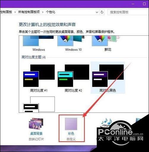 10、在主题窗口页面中,我们点击页面底端的“彩色”按钮,该按钮即Win7系统中的窗口颜色设置路径,点击该设置项目,我们就可以直接跳转到个性化设置页面中的颜色设置项目,具体的设置方法请参考上面的步骤。
