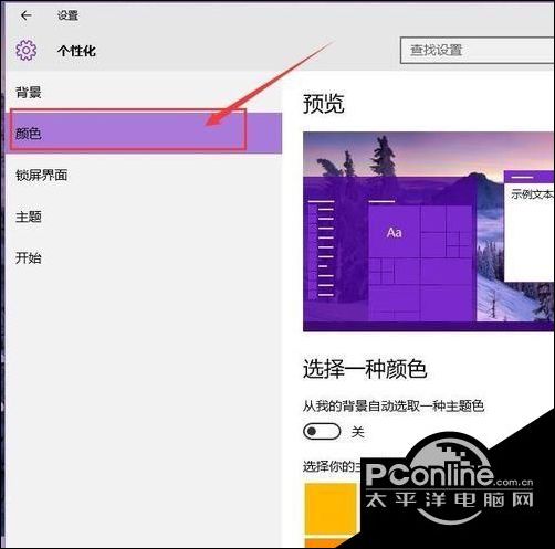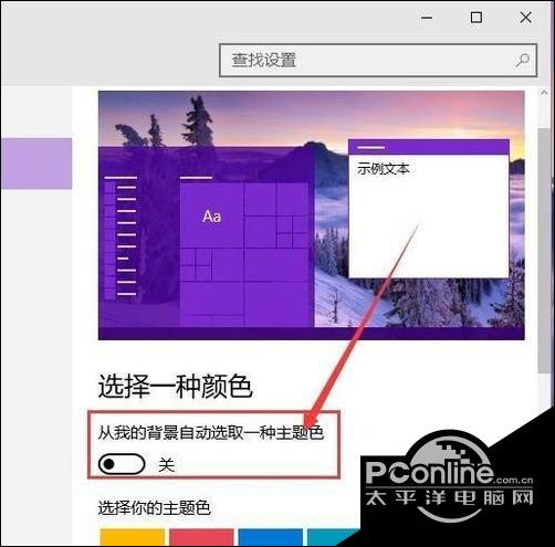 5、接下来,我们可以对窗口颜色分别做一个简单的设置。在颜色设置页面顶端,我们可以看到“从我的背景自动选取一种主题色”设置开关,如果你不想手动设置颜色的话,可以点击开启该开关,窗口颜色即可自动设置。