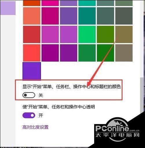 4、接下来,我们现将页面转到颜色设置页面最底端,将“显示开始菜单、任务栏、标题栏颜色”的开关打开,该开关默认处于关闭状态,对于处于关闭状态的开关,窗口颜色将默认是不开启的。