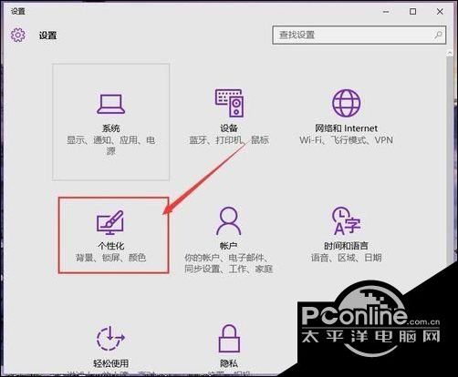 2、在Win10系统设置页面中,我们点击页面中的“个性化”菜单选项设置,打开系统个性化设置页面。