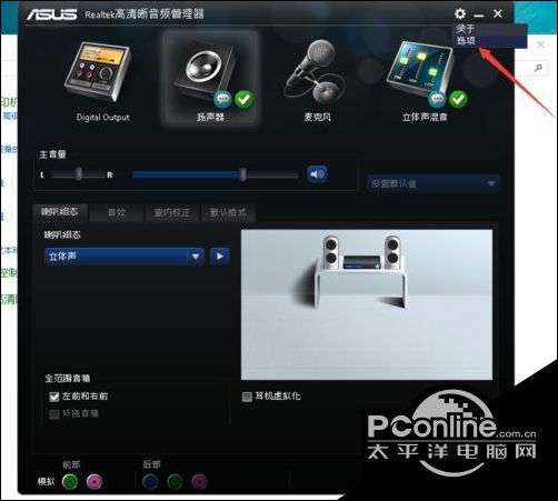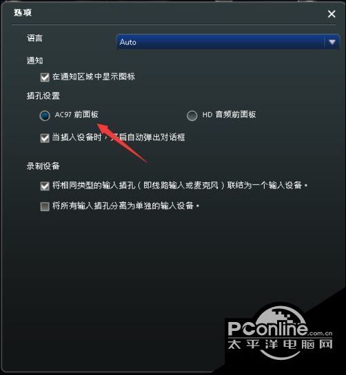 注:有的没有这个选项,但可以在在右上角设备高级设置后选取“在插入前方设备后禁用后面设备出声”也可以。