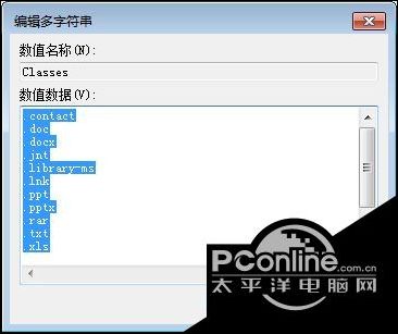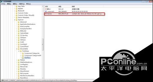 4、按照HKEY_CURRENT_USER\Software\Microsoft\Windows\CurrentVersion\Explorer\Discardable\PostSetup\ShellNew\Classes的路径寻找,最后一步的classes是在右侧中的键,而不是左边的;