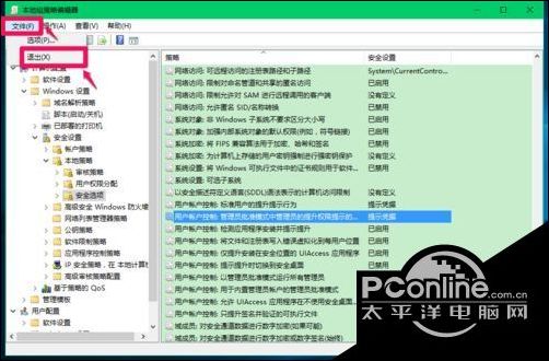 点击窗口左上角的【文件】,在下拉菜单中点击【退出】,退出本地组策略编辑器。