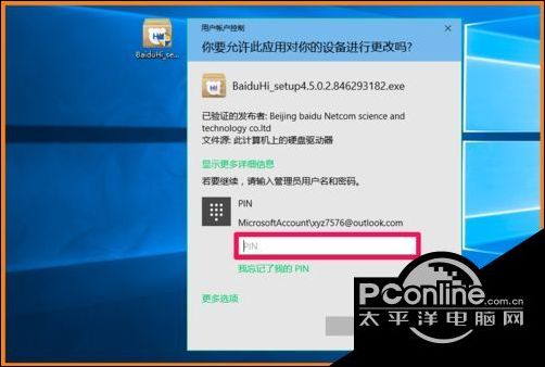 如安装百度Hi,左键双击百度Hi安装图标后,弹出用户帐户控制窗口,需要输入PIN密码才能安装百度Hi。