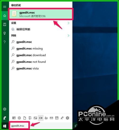 1、在系统桌面左下角的搜索栏中输入:gpedit.msc命令,点击【gpedit.msc - Microsoft通用管理文档】,打开本地组策略编辑器;