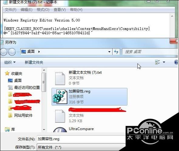 2、另存为“添加兼容选项.reg”文件(保存类型选项所有文件);