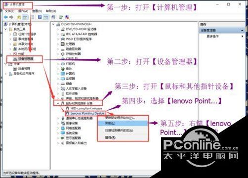2、弹出【计算机管理后】找到【设备管理器】后【单机左键】,找到【鼠标和其他指针设备】后单机找到【lenovo Point...】右键【卸载】。