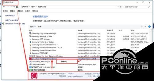 4、在弹出的【控制面板】下找到【程序】→【卸载程序】→找到【synaptics pointing device driver】右键【卸载】→单机【确认】→卸载后【重启】计算机。