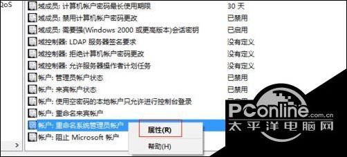 7、如果想修改管理员账户的名字,找到“账户,重命名系统管理员账户”,右键单击,选择属性。