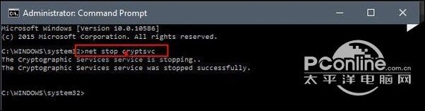 2、出现的命令窗口中,输入后面的命令netstopcryptsvc停止相关;