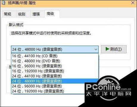 如果以上都没问题,还可以尝试改变一下默认声音格式,有时候电脑不能发声是因为声音采样频率以及位深度不合适所致。你可以在声音→播放中选择你的默认音频播放设备,点击“属性”,然后选择“高级”选项卡,在“默认格式”中选择合适的项目,选好后点击旁边的“测试”按钮,如果能听到声音播放,说明选择正确。