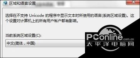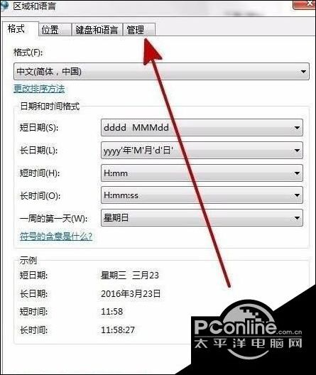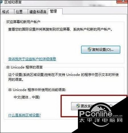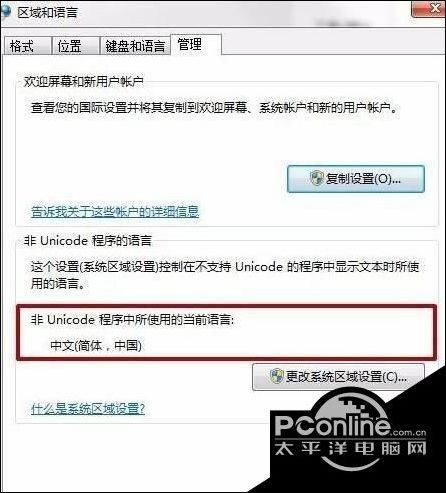 4、切换到“管理”面板,查看非unicode程序语言是否为中文。