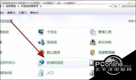 2、控制面板的查看方式选择“大图标”或“小图标”。选择“区域和语言”点击打开。